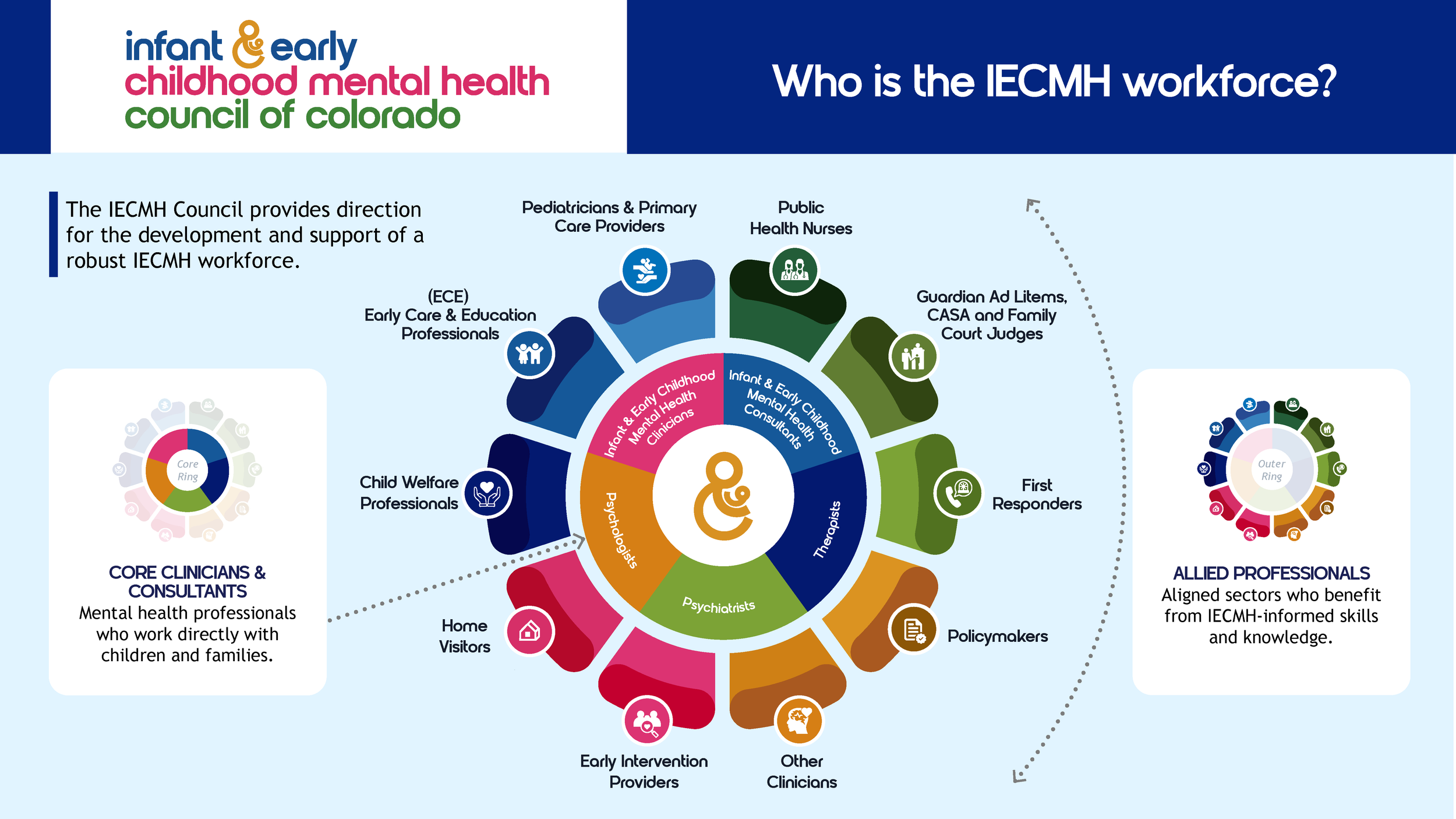 The IECMH Council of Colorado is a collaborative of partners leveraging their expertise and experience to guide the ongoing development and implementation of a robust, equitable, accessible continuum of mental health services and supports in Colorado, from promotion and prevention to intervention and treatment for expecting and pregnant persons, infants and young children through age 5 and their families and communities.