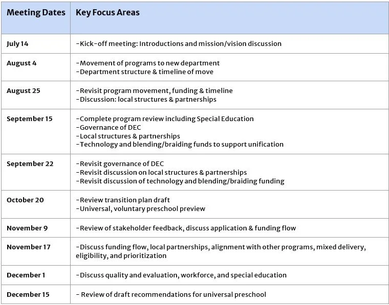 The TAG was comprised of a wide array of diverse public and private perspectives to ensure the recommendations reflect the full spectrum of early childhood programs and services. This included parents, members of the early childhood workforce, providers, school districts, human services leaders, local Early Childhood Councils, and other stakeholders.