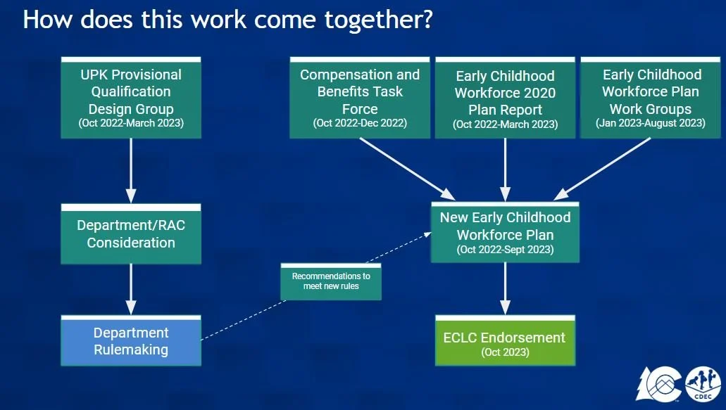 Upon the completion of the UPK Recommendations, an interagency workgroup began meeting to plan for the UPK Workforce; this group included individuals from the Governor’s Office, the Colorado Department of Higher Education, the Colorado Department of Education, and the Colorado Department of Early Childhood. The goal of this interagency group was to identify actionable strategies for interagency work to ensure an effective and thriving UPK workforce - both in numbers of teachers as well as ensuring they have the preparation and support needed to be successful in the classroom. A design team has been convened to provide input and guidance on a potential provisional qualification pathway for UPK teachers. While UPK standards and staff qualification requirements are not yet determined and will, ultimately, be finalized through the CDEC rule making process, the deliverable of this design team is to provide a recommendation to the CDEC senior leadership team for a UPK Provisional Qualification process that aligns to the following Colorado Universal Preschool Recommendations: